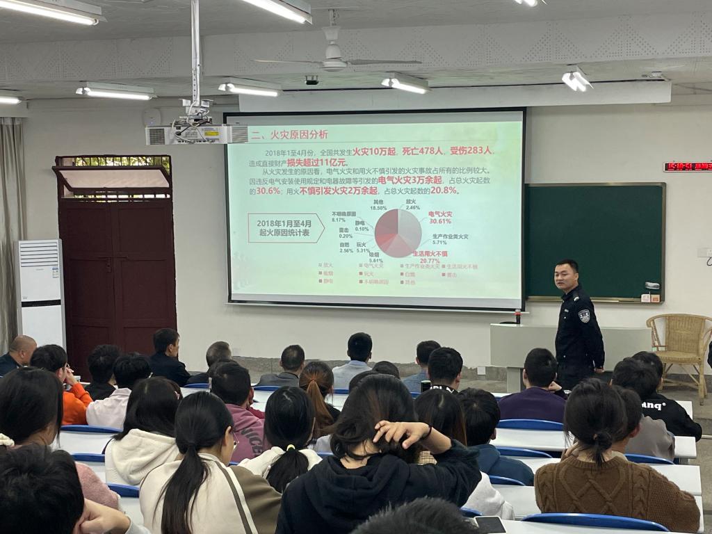 首先,进行了消防安全讲座,主讲人特勤队副班长杨宇从消防工作概述、消防基础知识、火灾典型案例及原因分析、常见消防标志和设施器材、火灾处置与逃生等五个方面展开培训,参培师生认真听讲,踊跃回答主讲人提问。