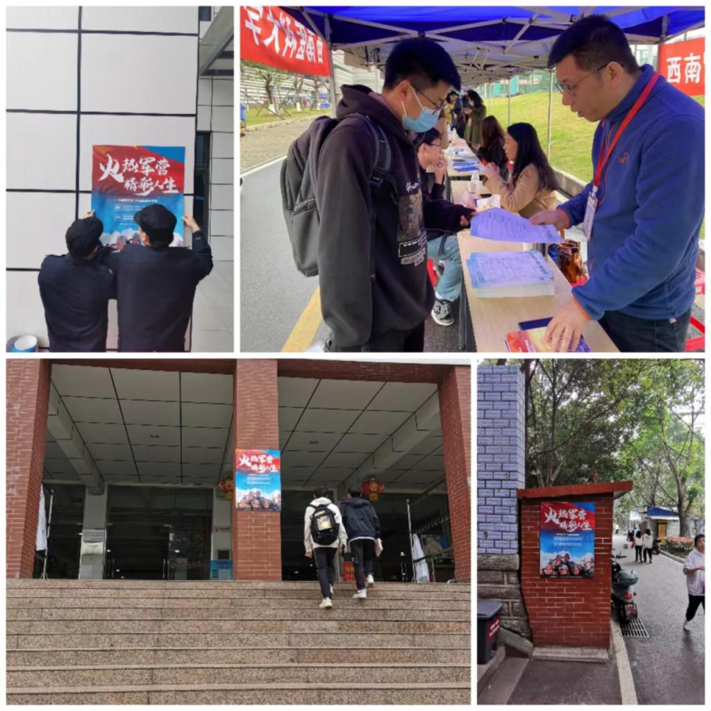 为提升宣传覆盖面,学校在两校区食堂、宿舍宣传栏,张贴14张2023年大学生征兵宣传海报,主题为“火热军营、精彩人生”;同时通过学校电子显示屏、食堂电视,循环播放《2023年征兵宣传片》。为使大学生了解、掌握征兵政策和报名流程,学校在2023届毕业生春季双选会现场摆点宣传,累计接受咨询100余人次,发放宣传资料200余份;通过学校微信公众号发布“去参军!让青春踏上新征程”宣传图文,宣传应征入伍政策,阅读量约3000人次。