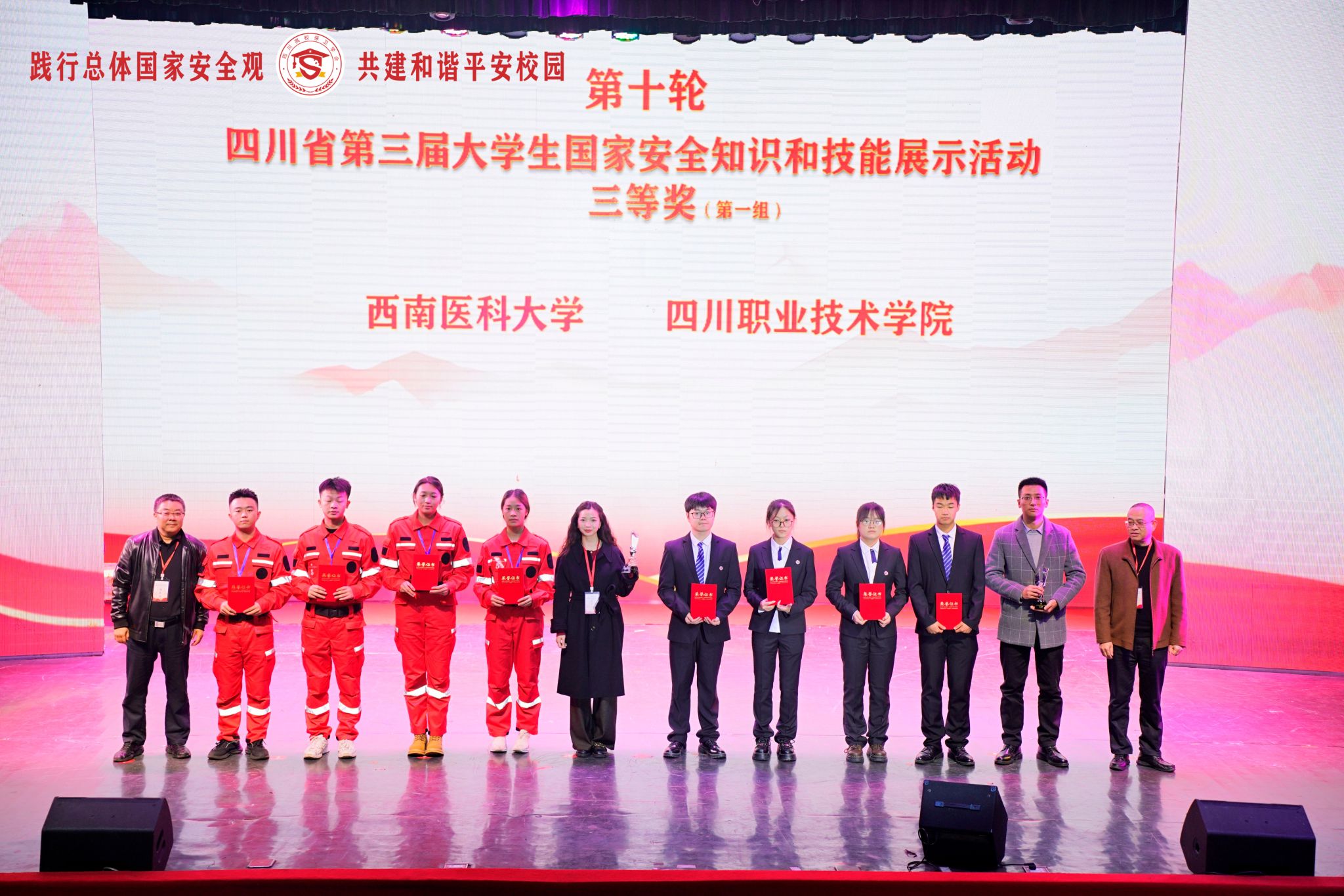 近日,由四川省教育厅、公安厅、国安厅指导,四川省高等教育学会高校保卫学专业委员会主办,西华师范大学承办的四川省第三届大学生国家安全知识和技能展示活动在南充举行。经过激烈角逐,beat365官网由保卫处副处长俞扬君担任领队、治安科副科长廖磊担任指导教师,药学院2022级罗秋月、体育学院2023级阮中正、公共卫生学院2022级吴建锡和张洋等4名学生组成的学校代表队最终获得本次比赛三等奖。