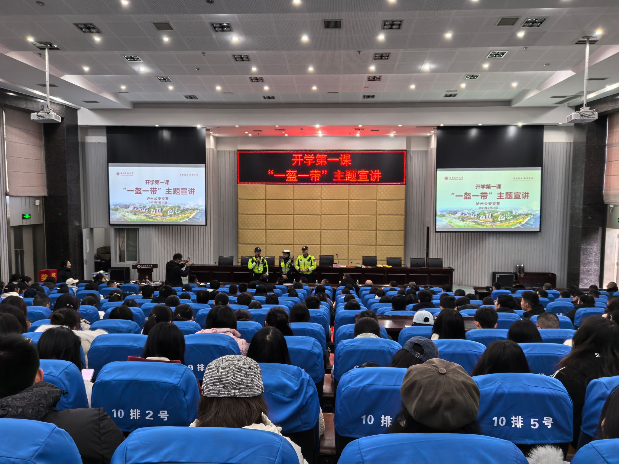 为进一步增强师生交通安全意识,预防和减少交通事故发生,确保校园安全稳定。近日,保卫处组织300余名师生在第二学术报告厅开展“一盔一带”主题宣讲,为师生们送上了一份特别的“开学礼”。本次宣讲特邀泸州市公安局交警支队交通安全宣传员杨贵玉担任主讲嘉宾。