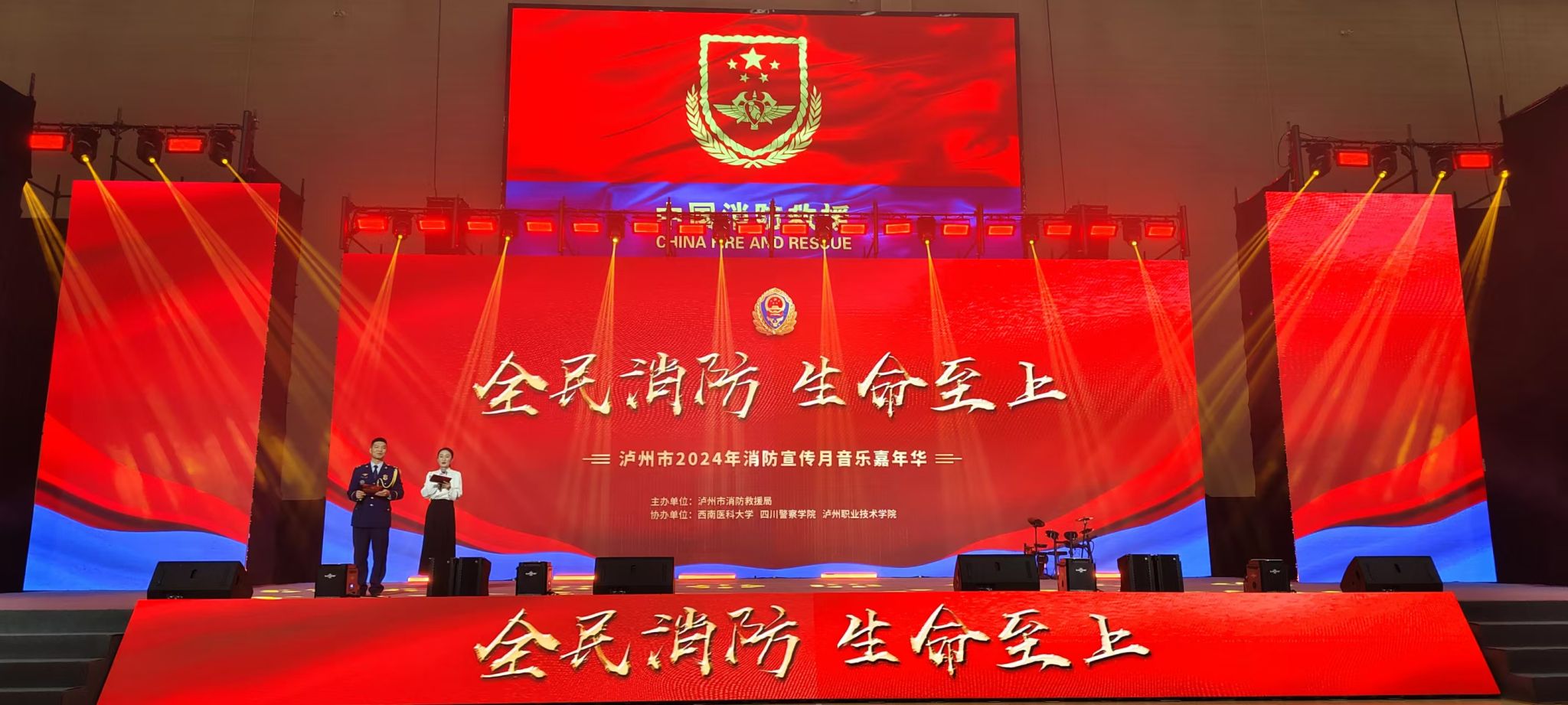 11月9日下午,泸州市2024年消防宣传月音乐嘉年华在beat365官网城北校区青年体育馆举行。本次嘉年华以“全民消防、生命至上”为主题,由泸州市消防救援局主办,beat365官方网站、四川警察学院、泸州职业技术学院承办。学校党委副书记、工会主席刘毅,四川警察学院党委常委、副院长郑友军,泸州市消防救援支队政治委员吴德政等出席活动。来自beat365官方网站、四川警察学院、泸州职业技术学院、泸州市消防救援局的观众及演职人员共1800人参加。